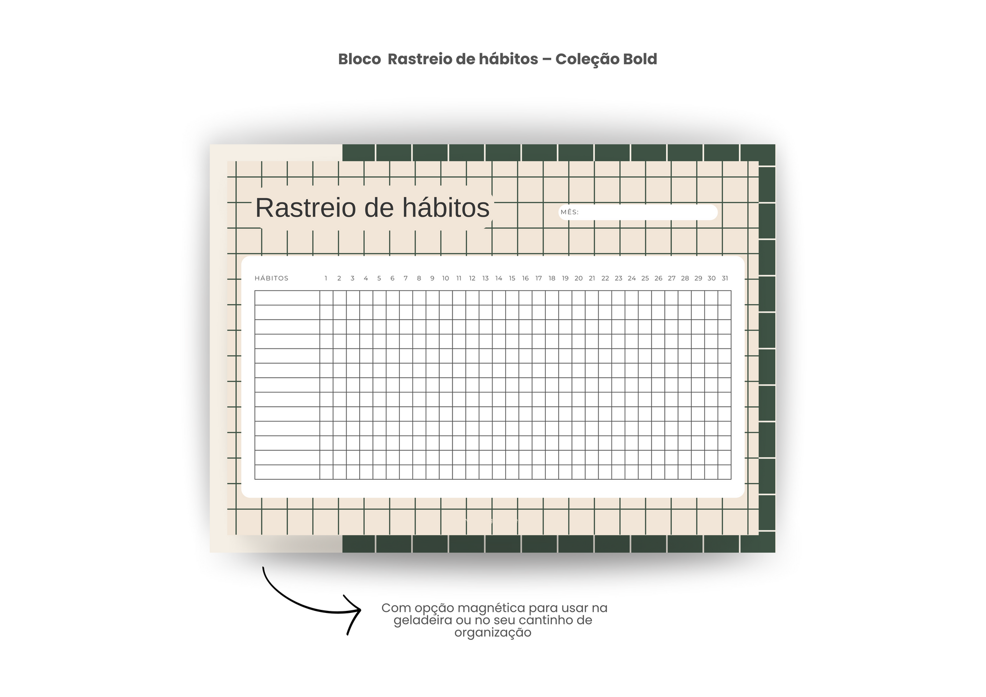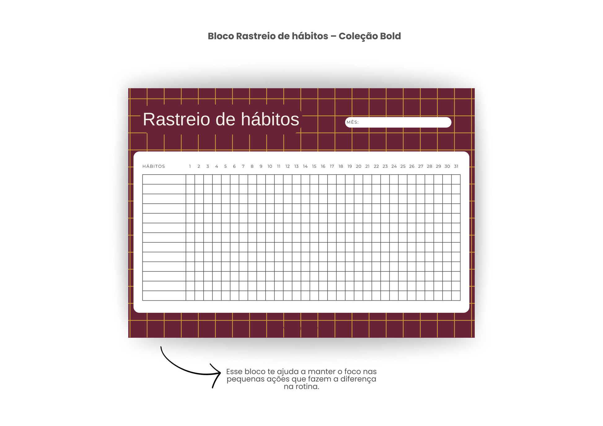 Com espaço para 10 hábitos e 31 dias, esse bloco te ajuda a manter o foco nas pequenas ações que fazem a diferença na rotina.