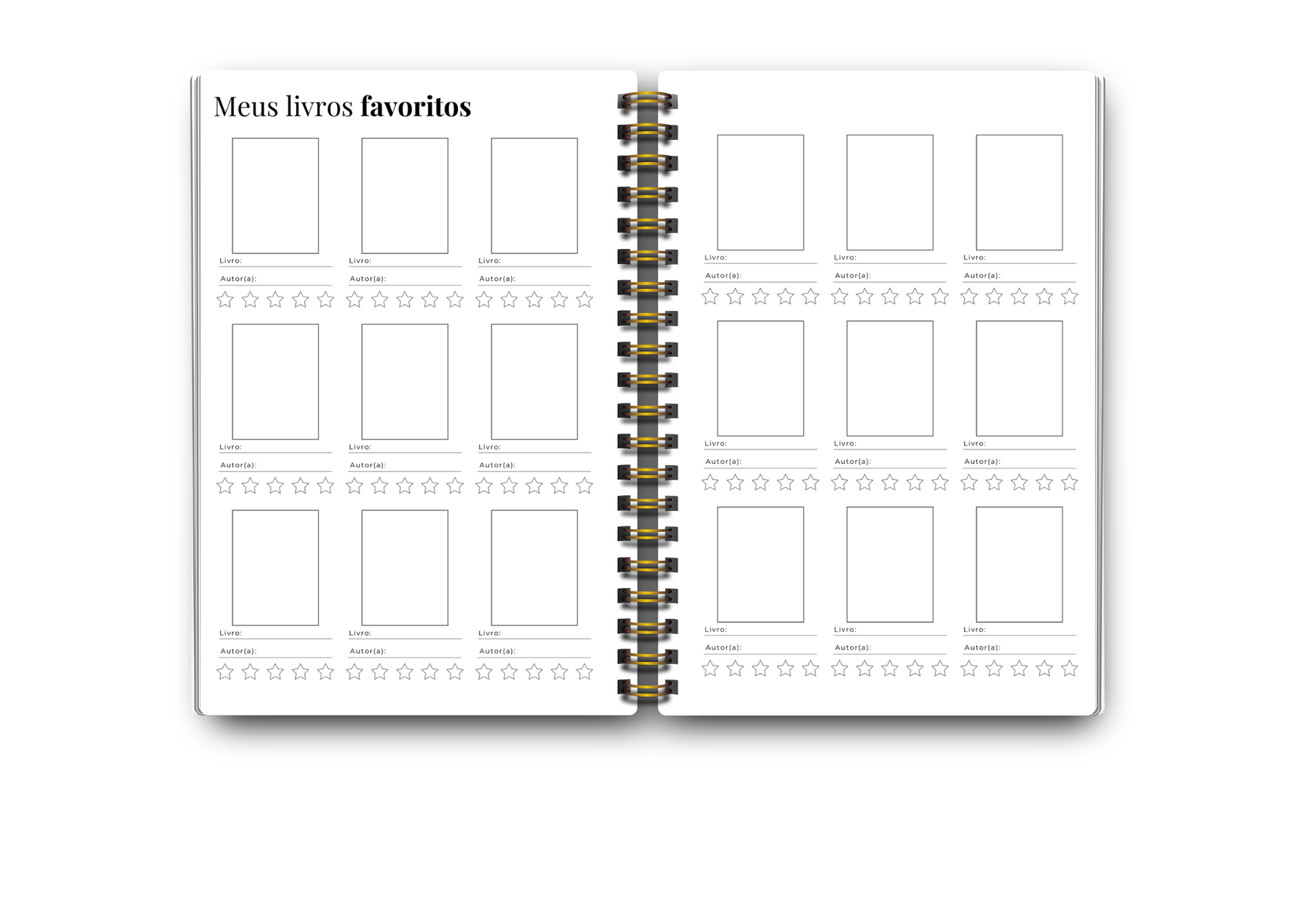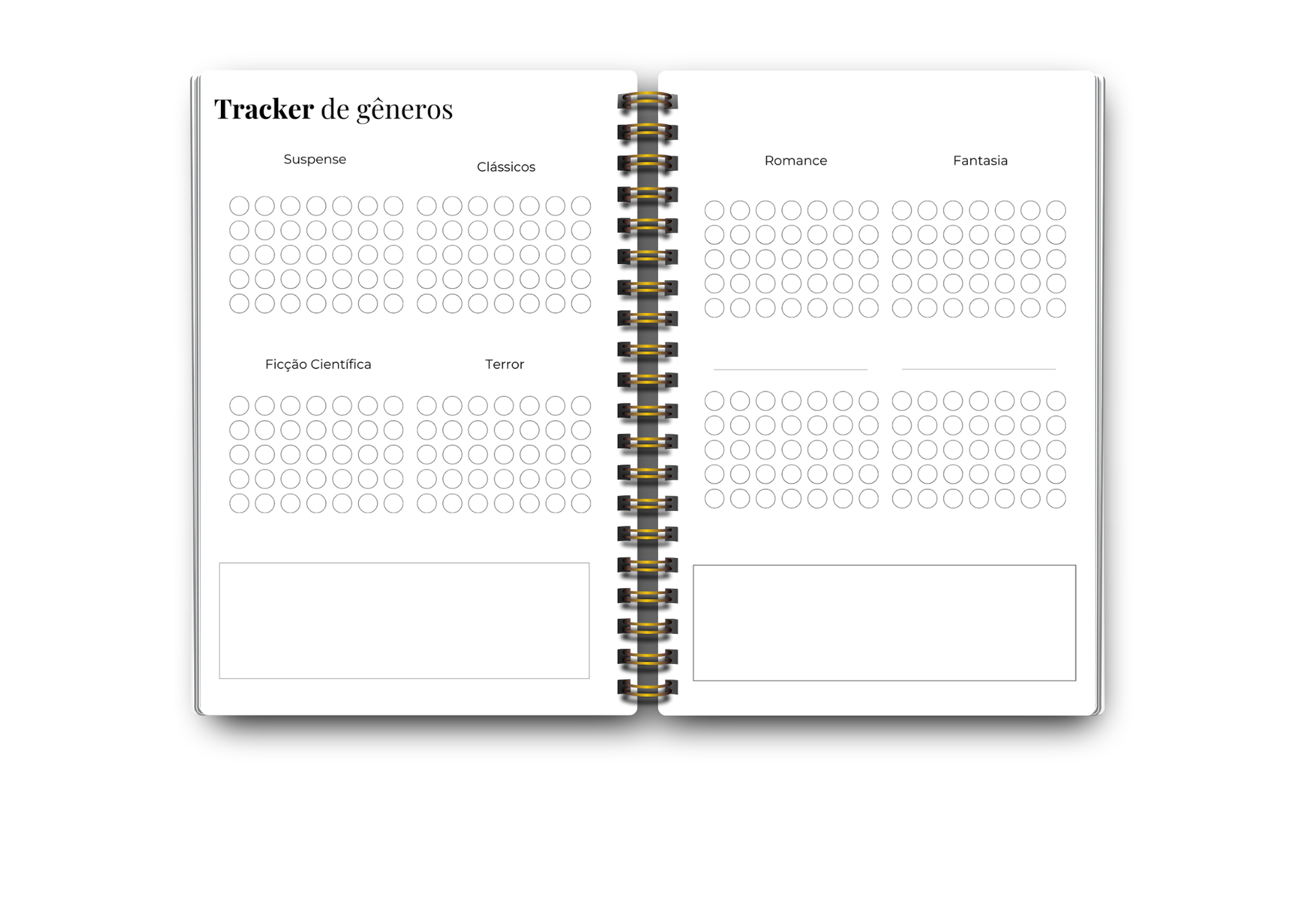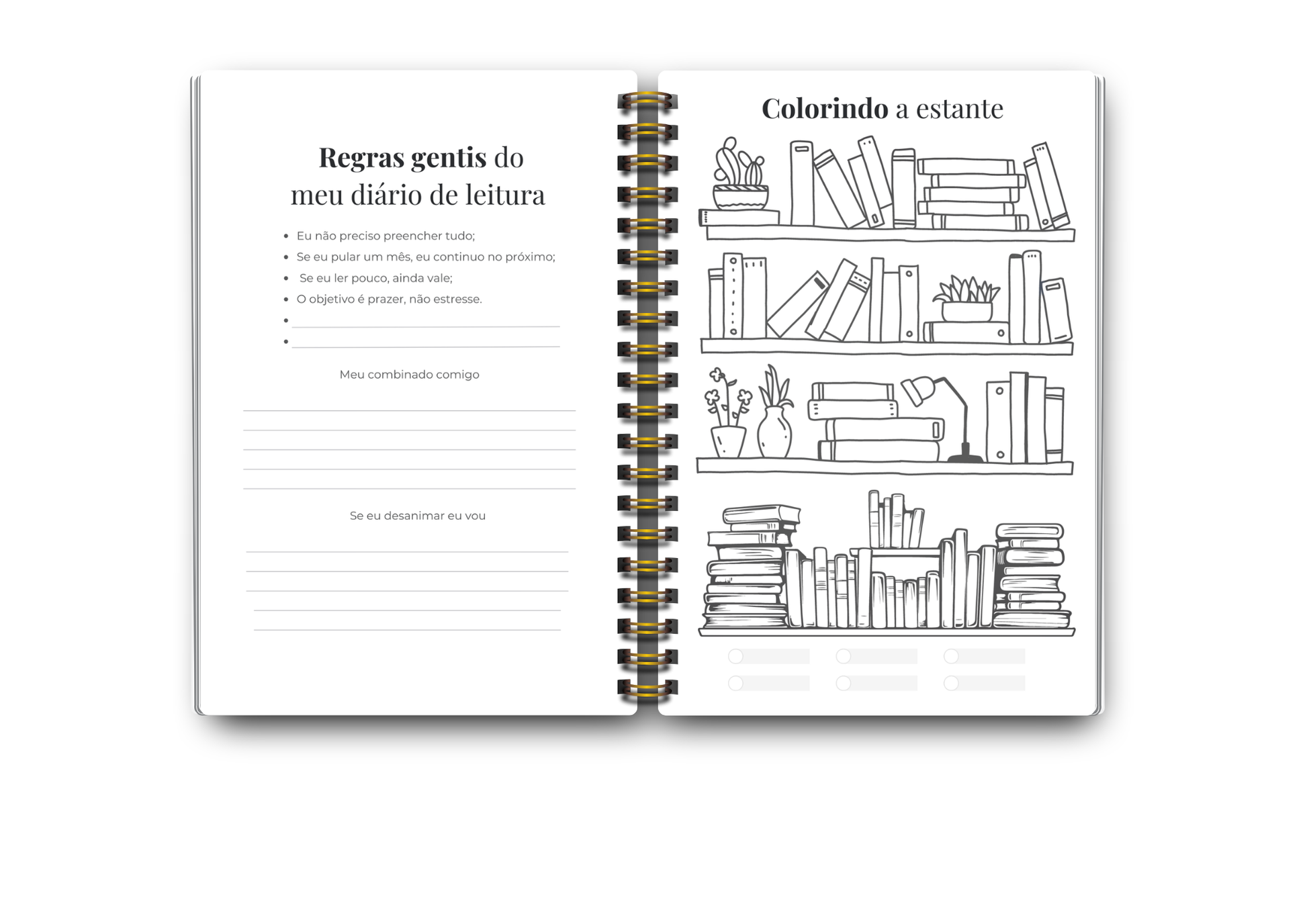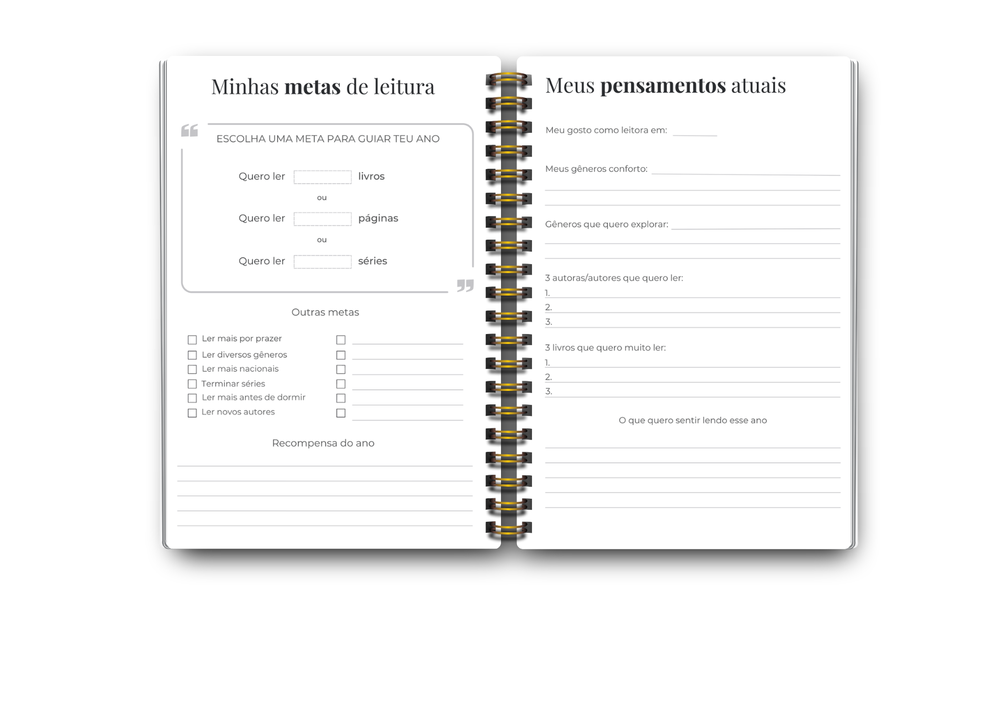 Ferramentas: metas, overview anual, tracker de gêneros e formatos, Para Ler do ano, wishlist, galeria de capas, desafios de leitura, páginas mensais completas, quotes, fechamento do ano e páginas extras de anotações