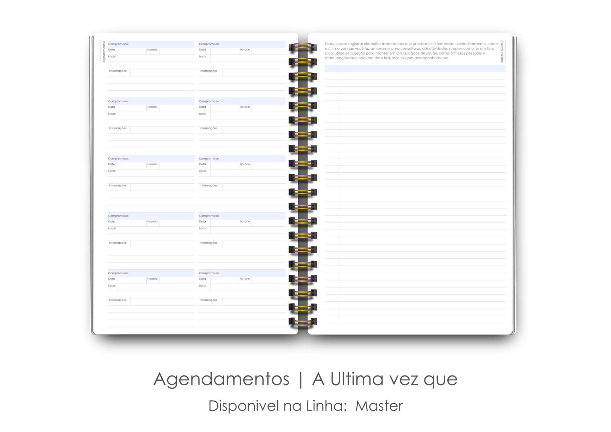 A Linha Master reúne todas as ferramentas das outras linhas e acrescenta recursos exclusivos para reflexão, desenvolvimento pessoal e organização estratégica. É o planner ideal para quem deseja um olhar detalhado e cuidadoso sobre a rotina, com espaço de sobra para planejar e registrar memórias.