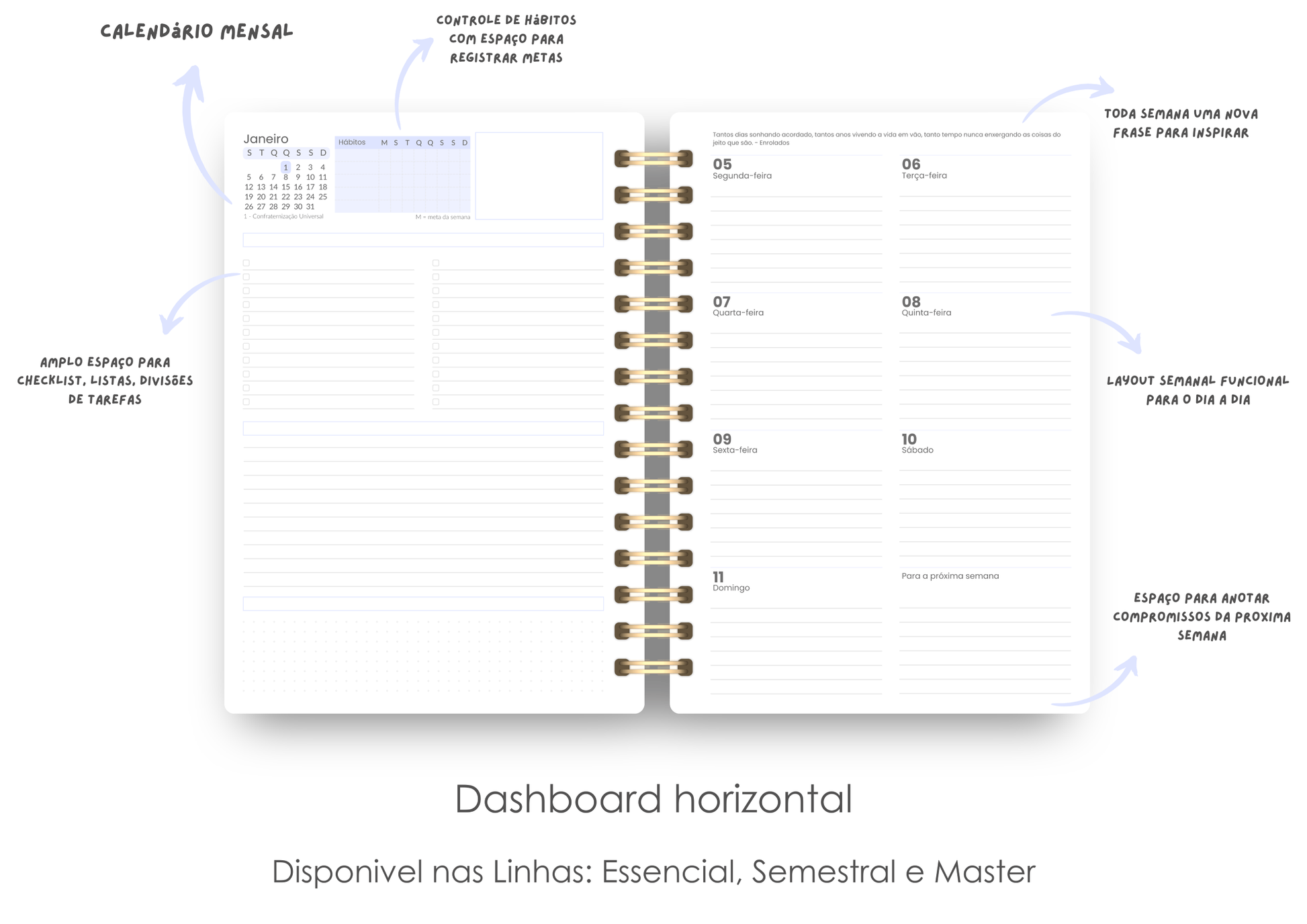 O Planner Semestral em 1 Volume é a opção ideal para quem prefere carregar menos peso no dia a dia e organizar a rotina com mais espaço. Cada planner cobre apenas 6 meses, e você escolhe no momento da compra se deseja o Volume 2026/01 (Janeiro a Junho) ou o Volume 2026/02 (Julho a Dezembro).
