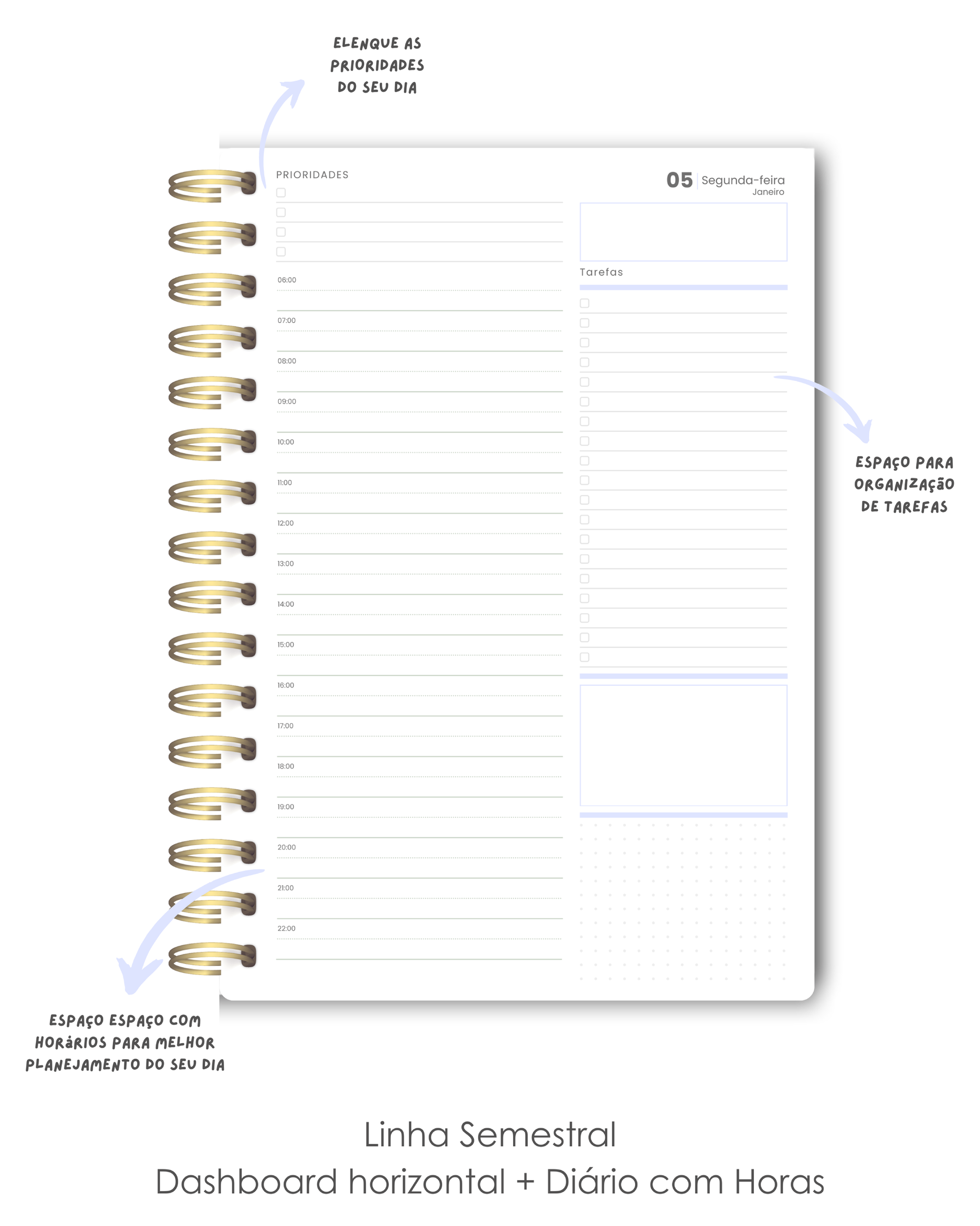 - 7 dias da semana no Layout Diário (1 página por dia), à escolha do cliente: